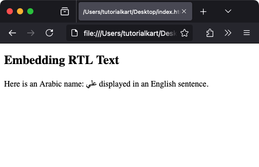 <p>Here is an Arabic name: <bdo dir="rtl">علي</bdo> displayed in an English sentence.</p>