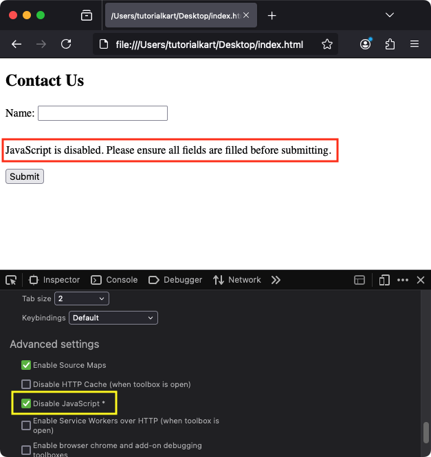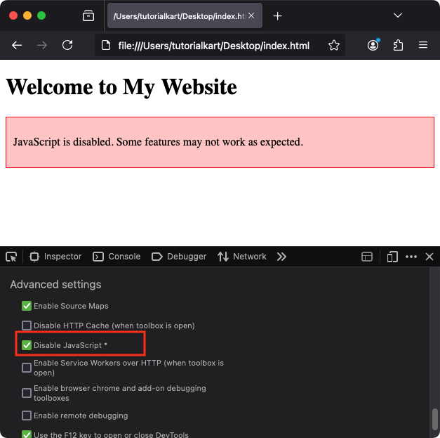 На снимке экрана вы можете заметить, что мы отключили JavaScript из инструментов разработчика в Firefox, что является причиной отображения элемента noscript.