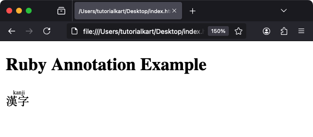 , «kanji» отображается как руководство по произношению над «漢字». В браузерах, не поддерживающих этот элемент, текст будет отображаться как «漢字(kanji)».